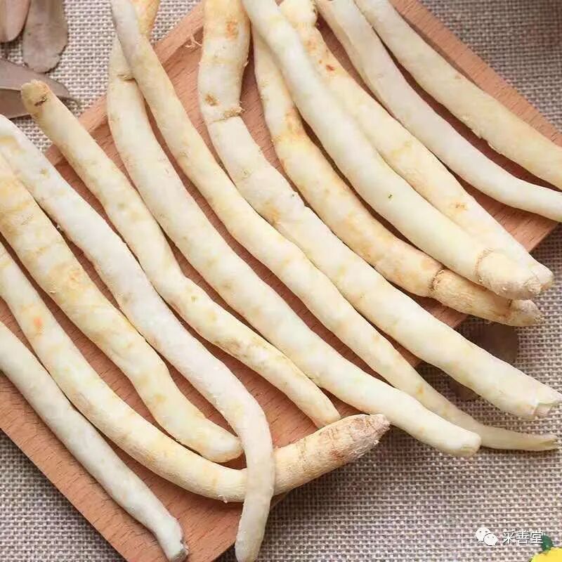 【性狀】呈細長圓柱形、長紡錘形或不規(guī)則條塊,長6~20cm,直徑0.5~2cm。表面黃白色或淡棕色,光滑或有縱溝紋和須根痕,有的具紅棕色斑點。質硬而脆,斷面角質樣,皮部較薄,黃白色,有的易與木部剝離,木部類白色。氣微,味淡。